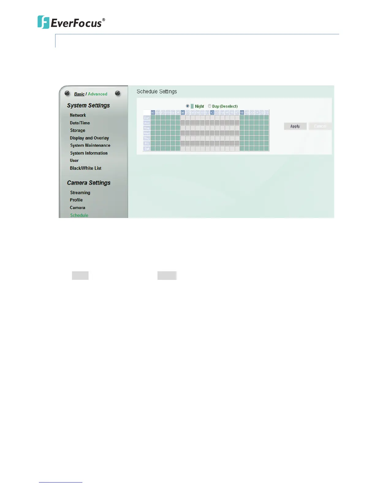 The Schedule setting is only functional if you select Schedule from the D/N Mode drop-down list on
