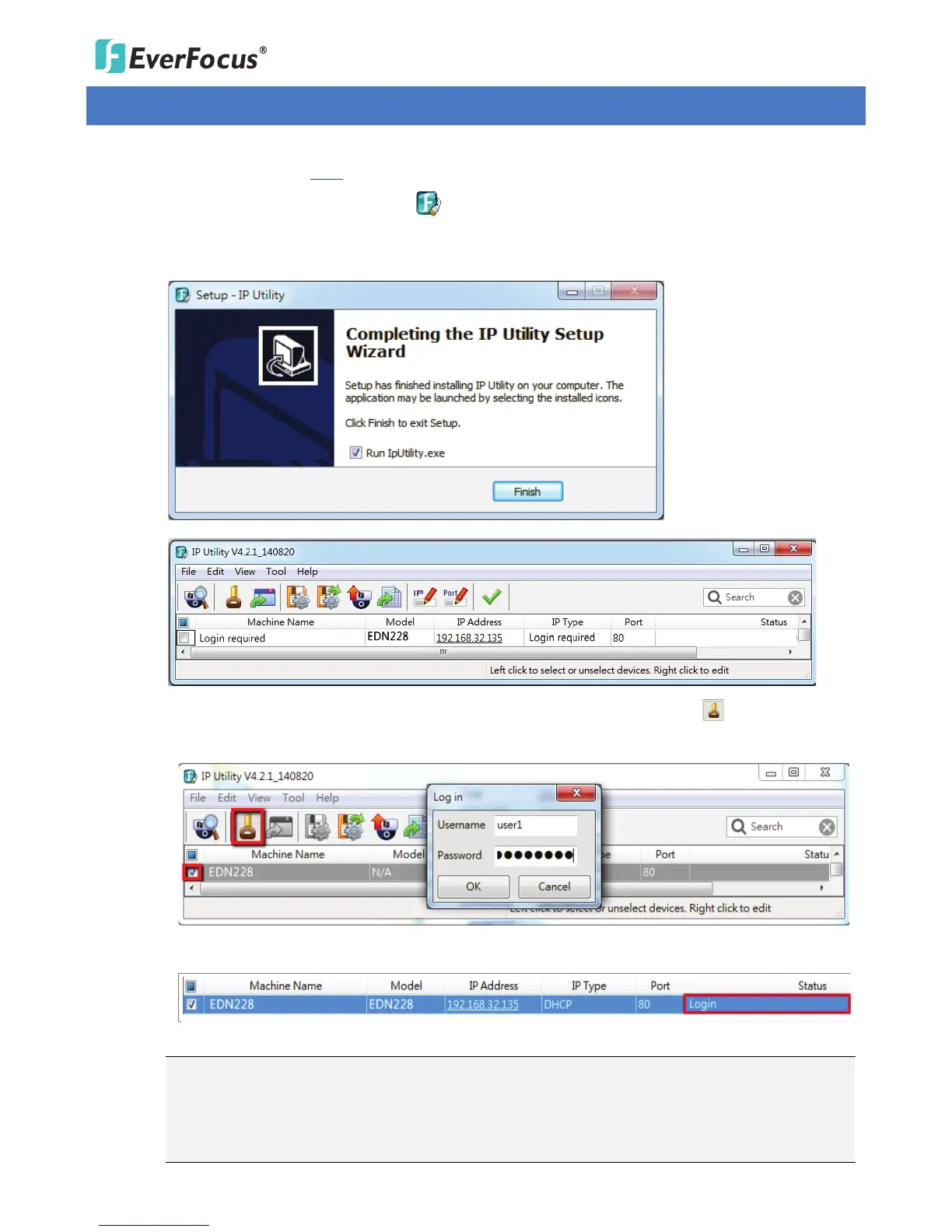 3. Type the Username and Password. Click the OK button, the Login status displays.