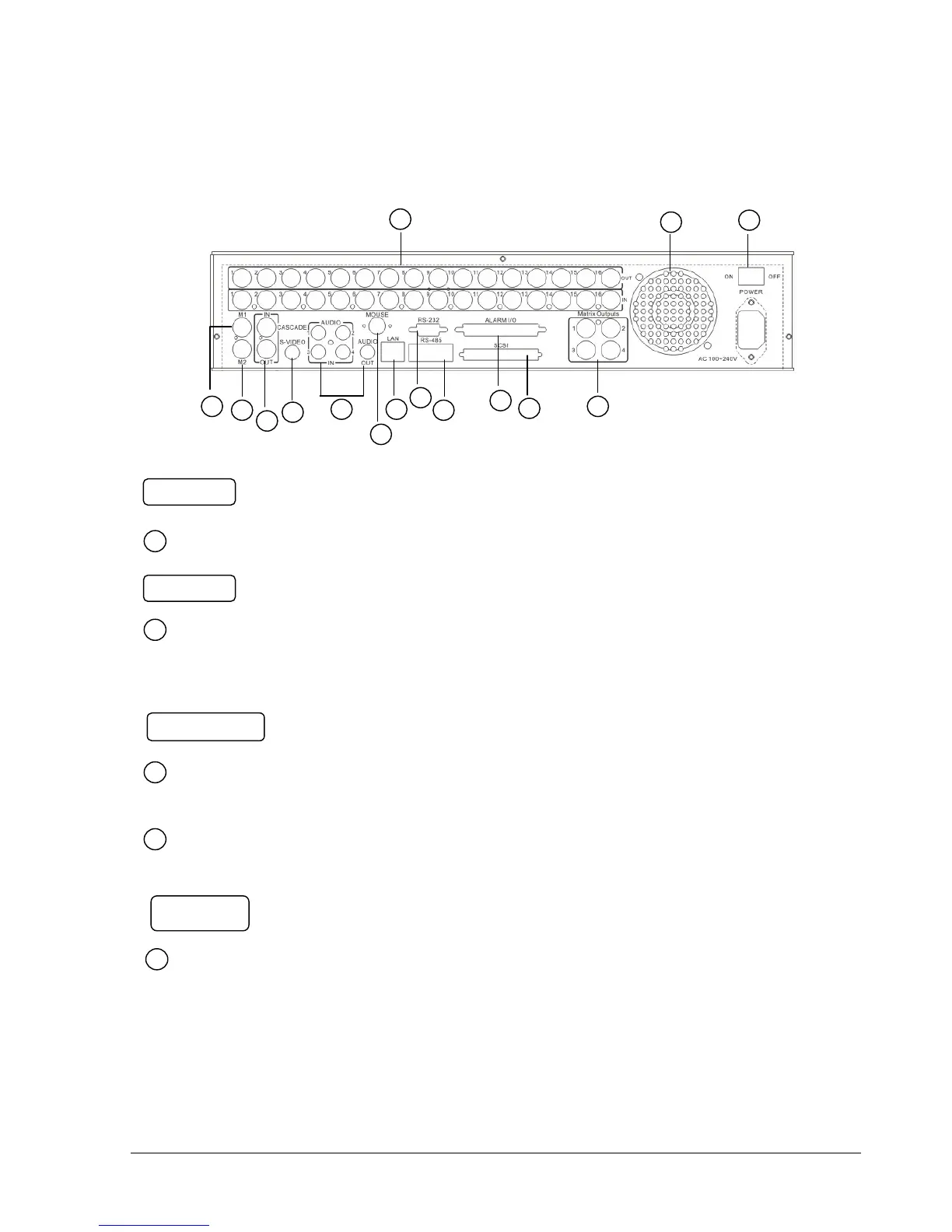 VIDEO OUT(1~16): Top row BNC connectors for video looping out 1~16.