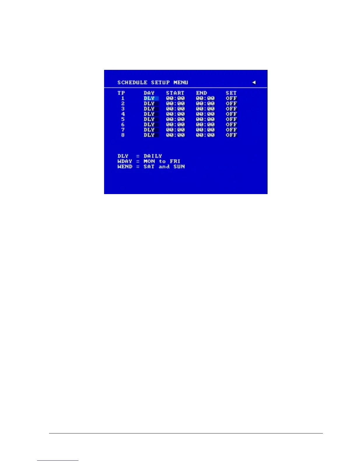 In the SCHEDULE SETUP MENU the following fields are defined as: