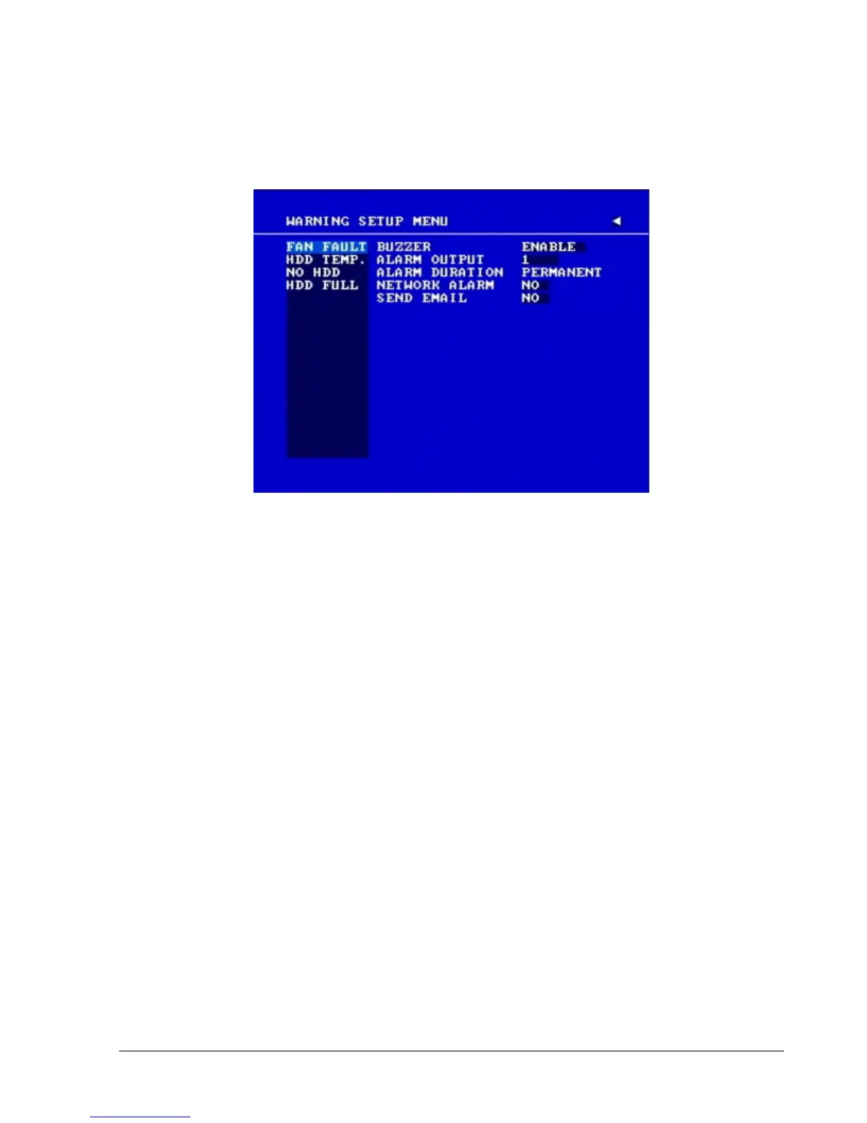 Diagram 3.19 is a screen shot of the Warning Setup Menu. This menu is to set the warning system