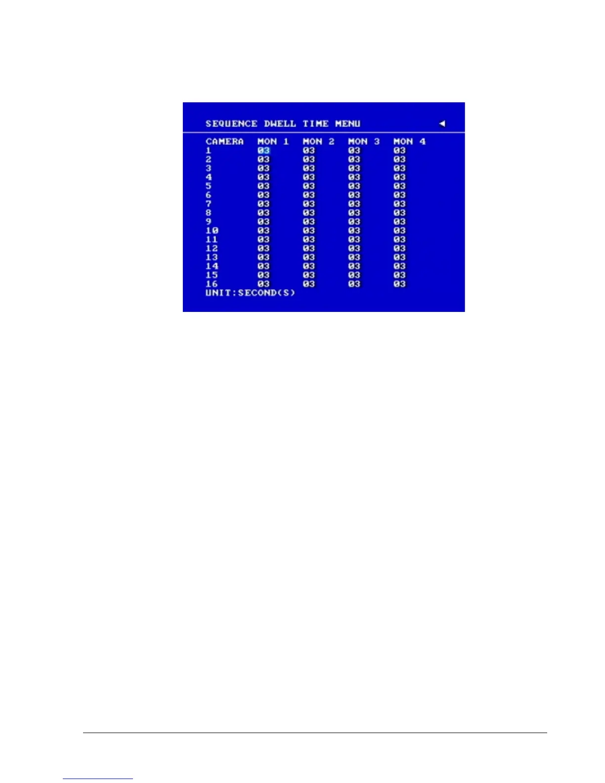 Dial jog to set sequence dwell time for each camera on matrix monitor 1~4. Sequence dwell time