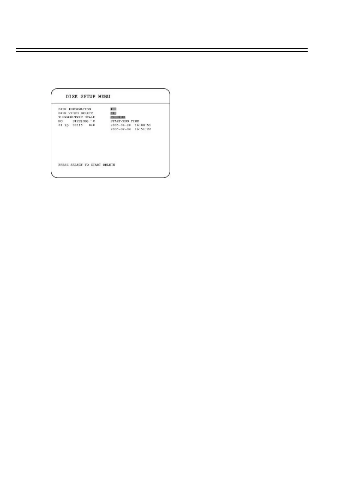 (2) DISK VIDEO DELETE: Select the disk that you wish to delete, then press SELECT button from the
