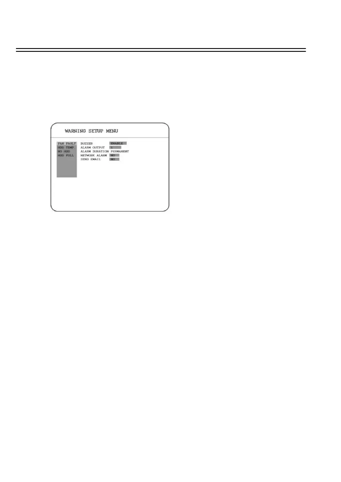 In Warning Setup Menu, you will be able to do warning setting when the following situations occur: