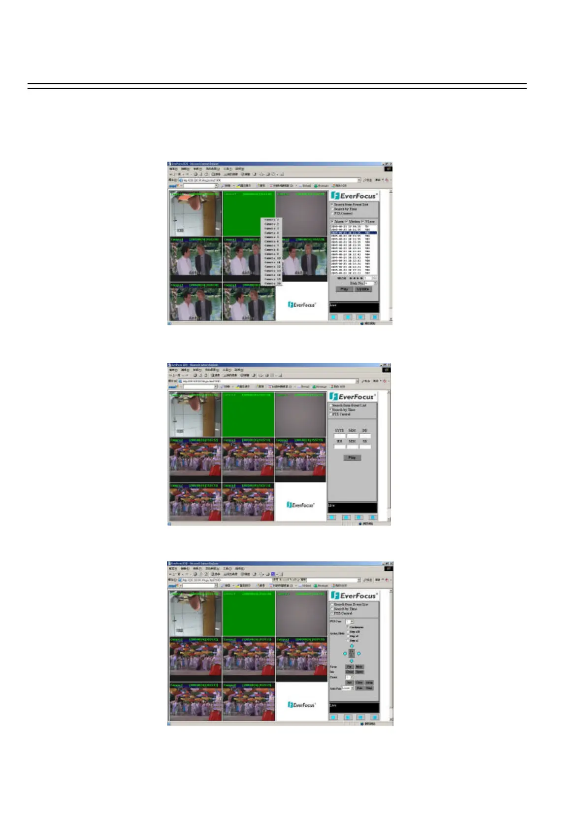 7. The system allows up to 3 ways to playback video, by EVENT LIST, Time and PTZ Control.