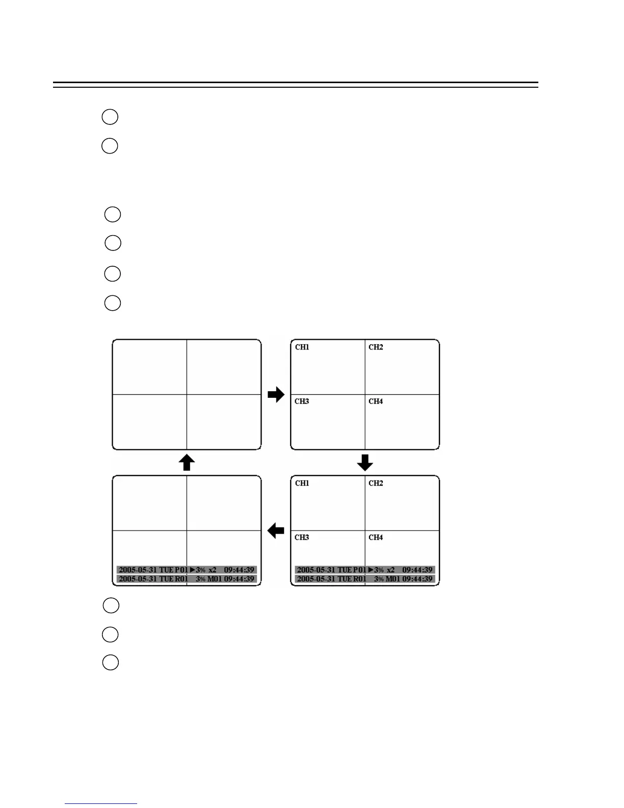 MODE: Switch PIP, 4, 7, and 8 displays in Live and Playback modes.
