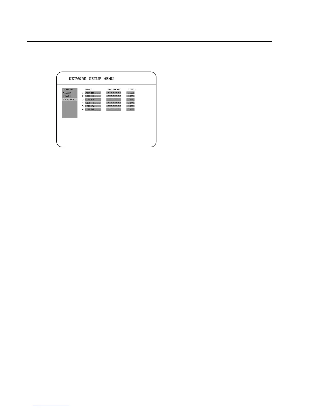 In the PASSWORD of the NETWORK SETUP MENU, we define :