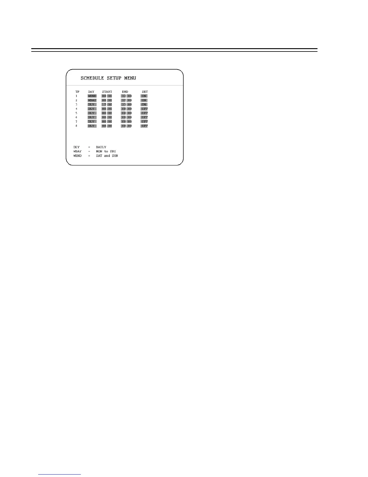3.8 SCHEDULE SETUP MENU