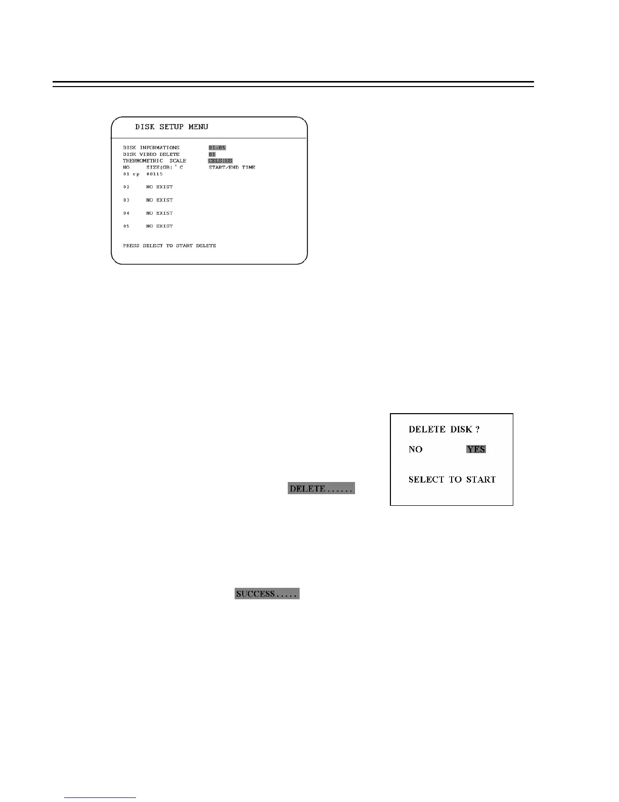 Note: System will ask you to stop recording if you delete the disk when system is in the recording mode.