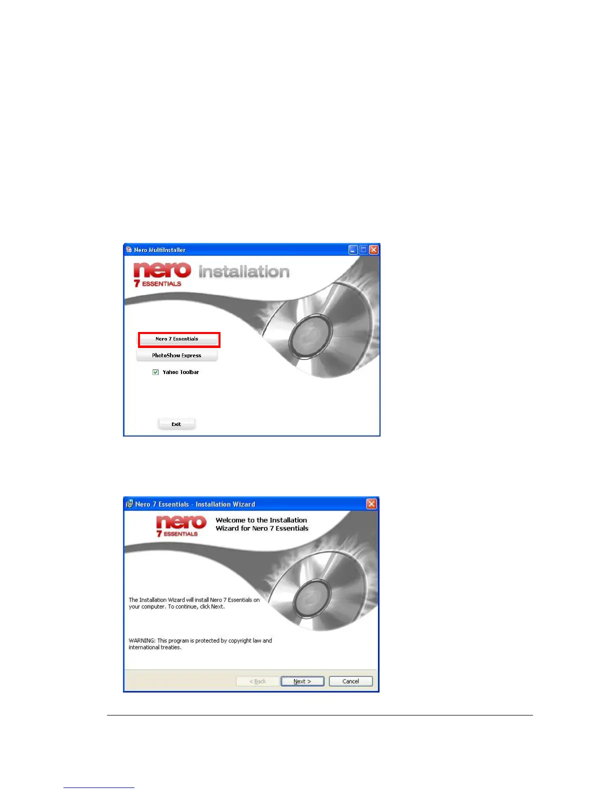 2. Click “Next” when Nero 7 Essentials installation wizard shows up.