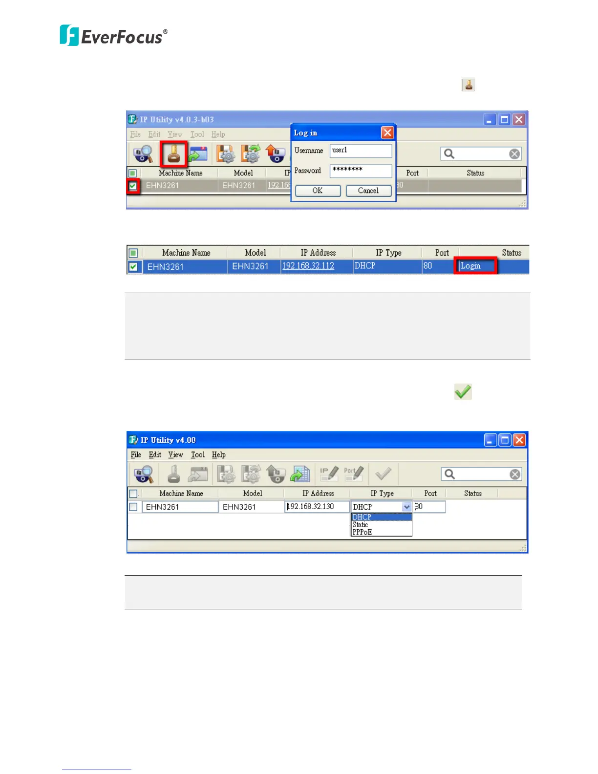 a. Log in the camera by checking the desired model and then click the Log in icon. The