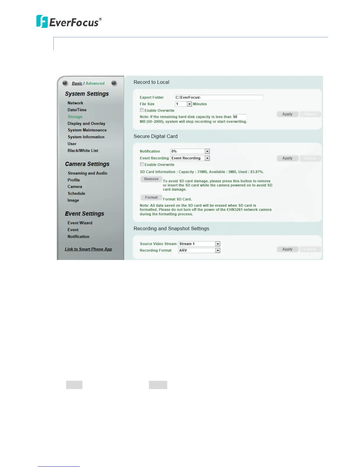 Export Folder: Type the storage path for storing the recordings / snapshot.