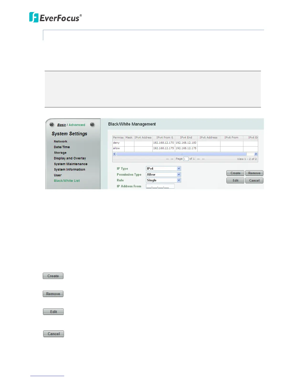 Use this page to specify IP addresses that are allowed / denied to access this camera. By default,