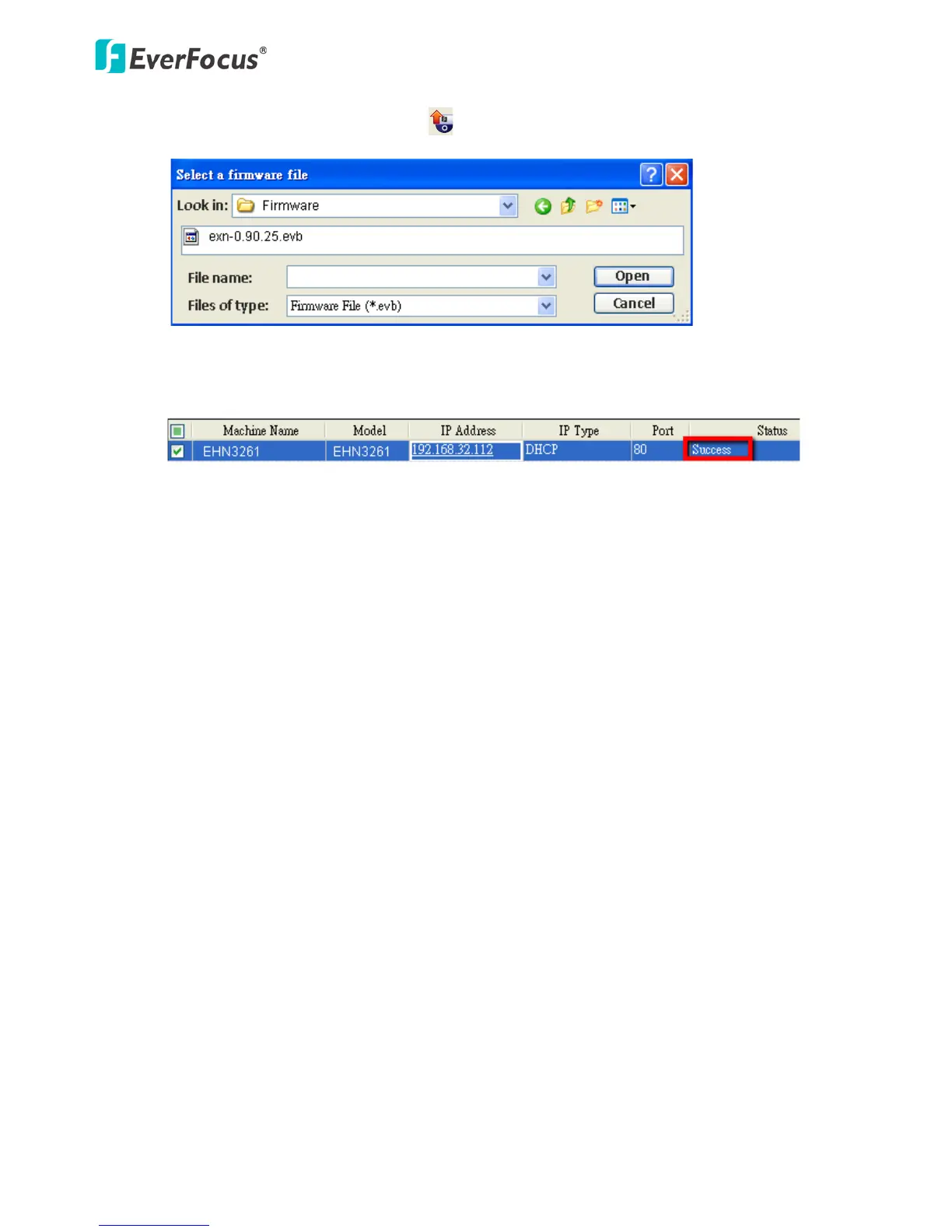 5. Select the firmware file (.evb) and then click Open. The IPU will automatically upgrade the
