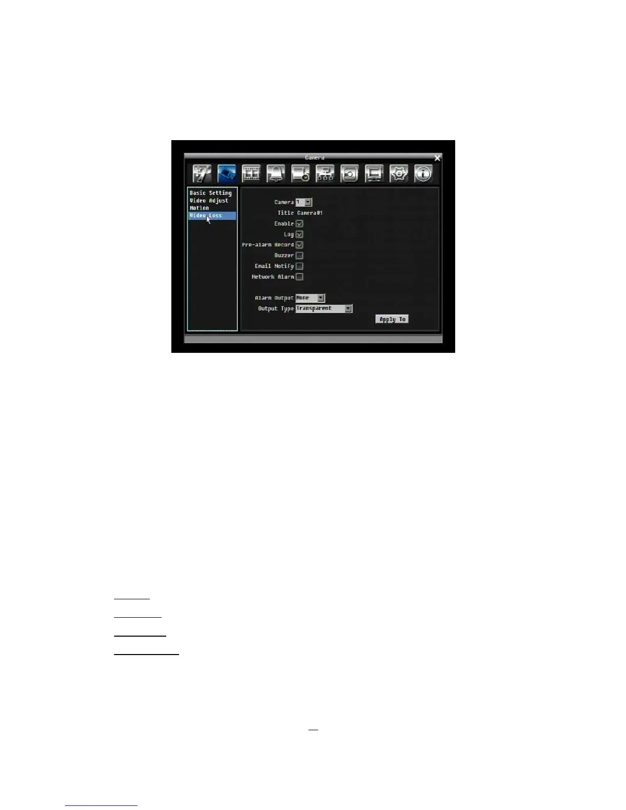 Enable: Check box to enable Video Loss.
