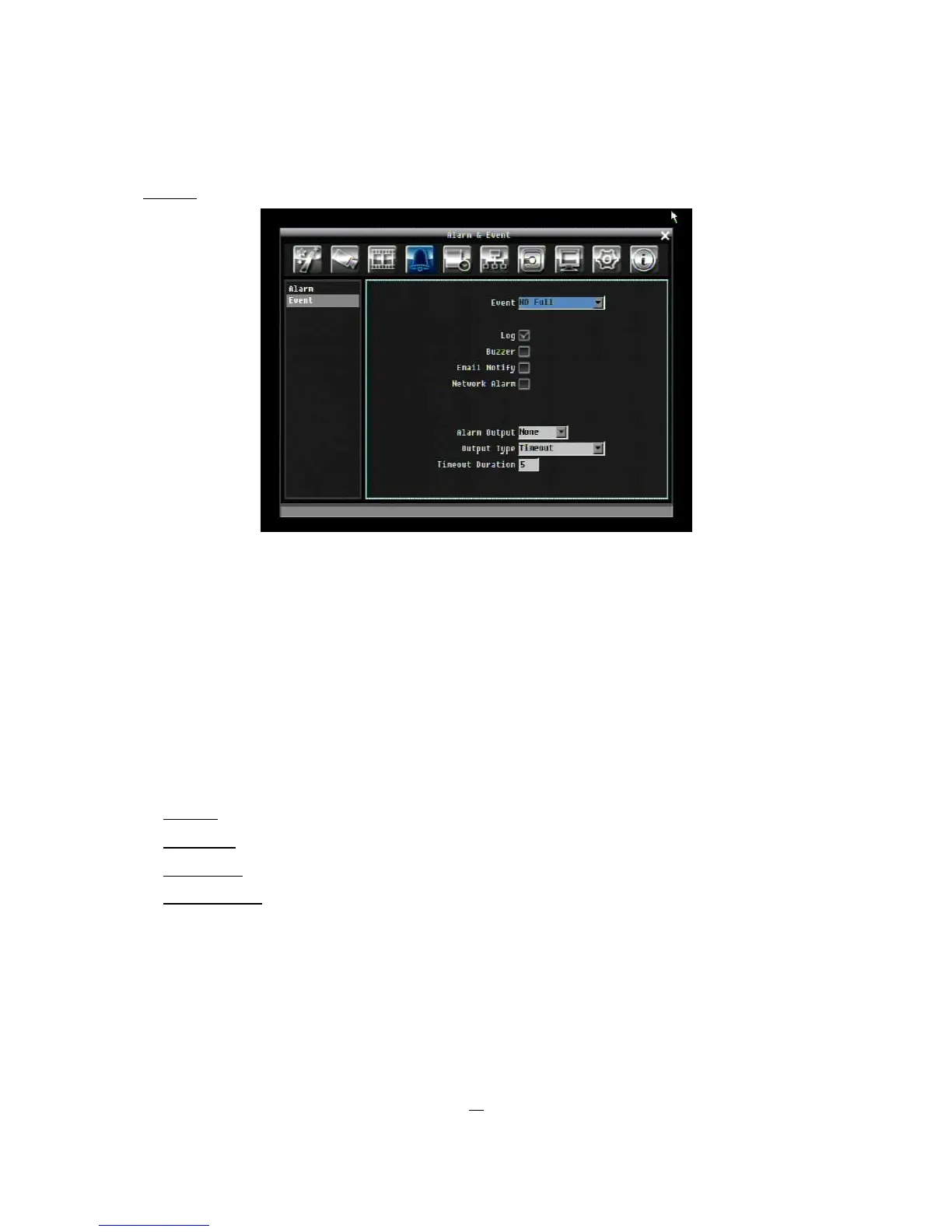 Alarm Output: This will transmit a signal through one of the alarm outputs. It can be set to either “NONE”