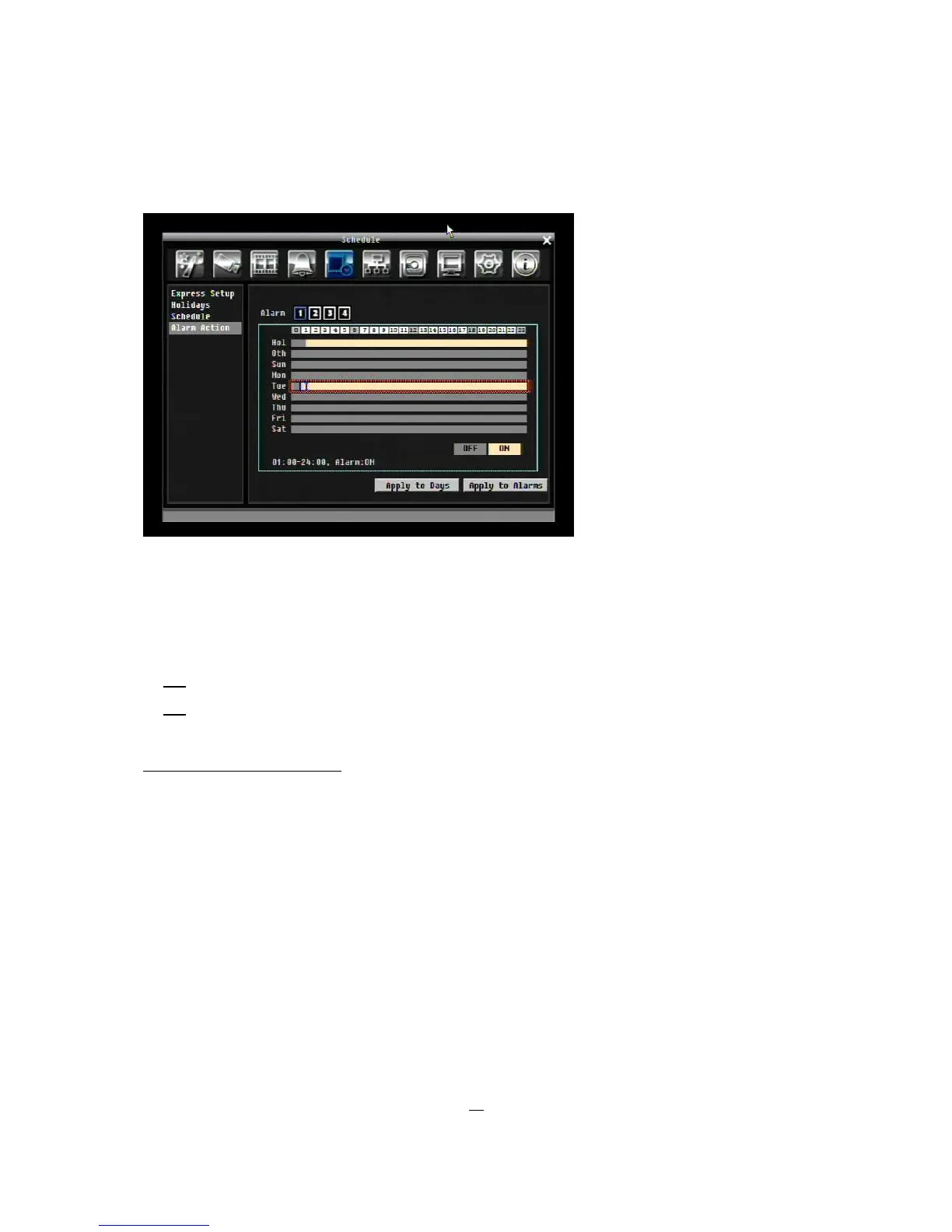 Alarm: Select a number to change the schedule for that alarm. Each alarm can be set on a 24 hour time
