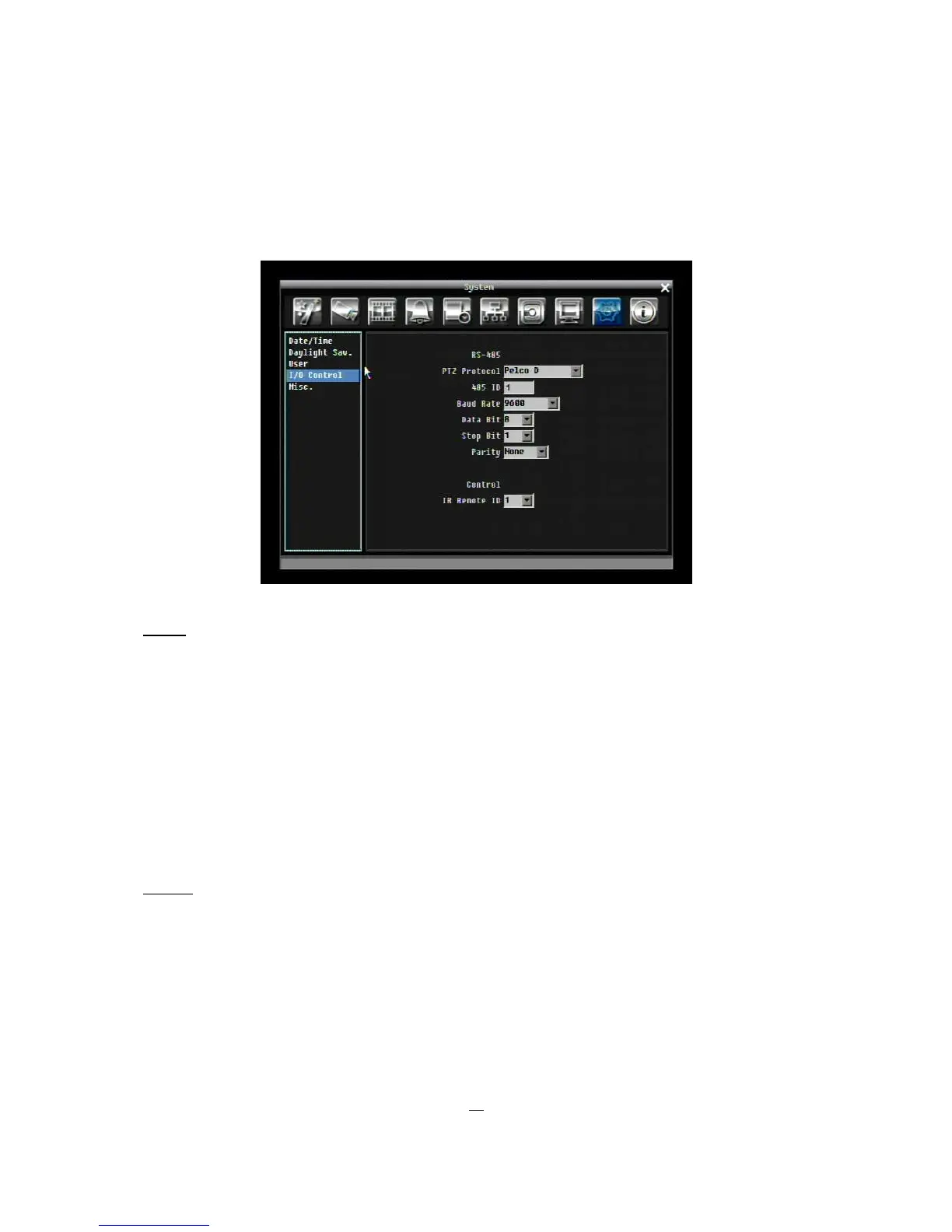 485 ID: If more than one DVR is used through the RS485 connection, each one must be assigned a unique