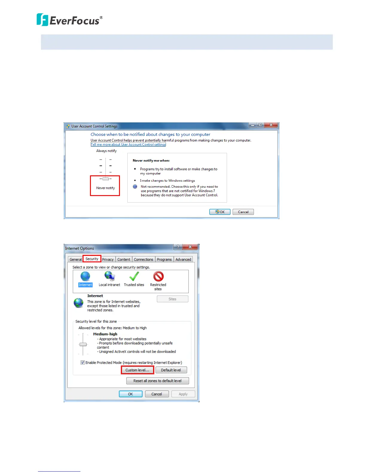 To enable Remote Live View, Firmware Upgrade and ActiveX Prompt on Internet Explorer, some settings