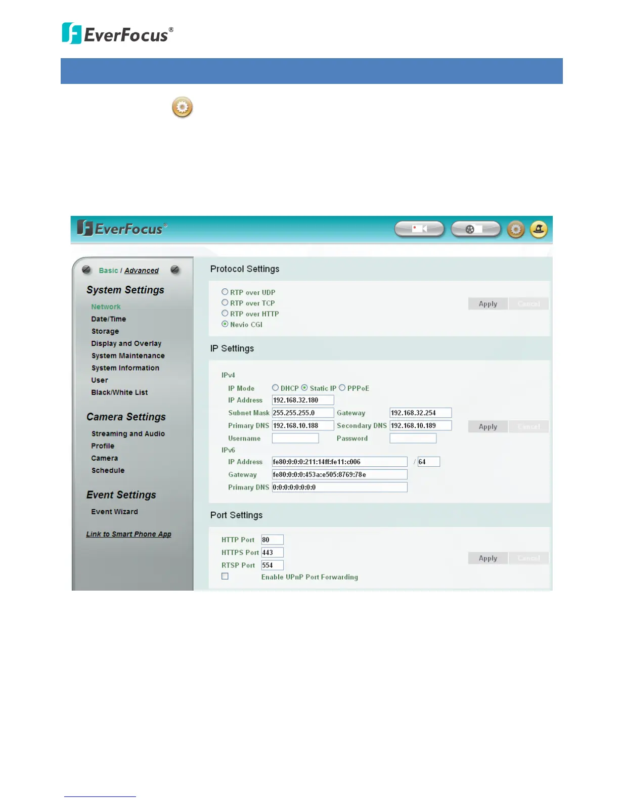 Click the Setting button on the Live View Window to enter the setting submenu. There are two tabs: