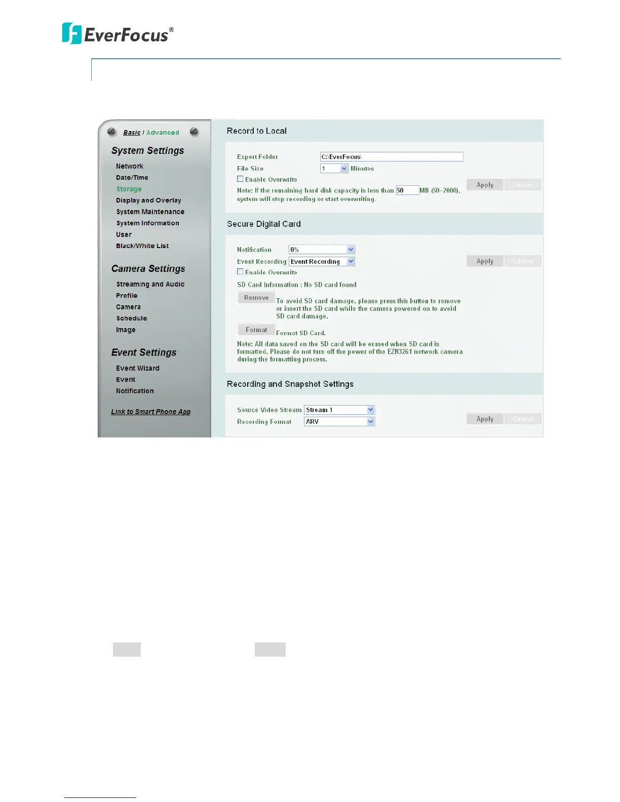 You can configure the recording path / format, source video stream and SD card settings on this