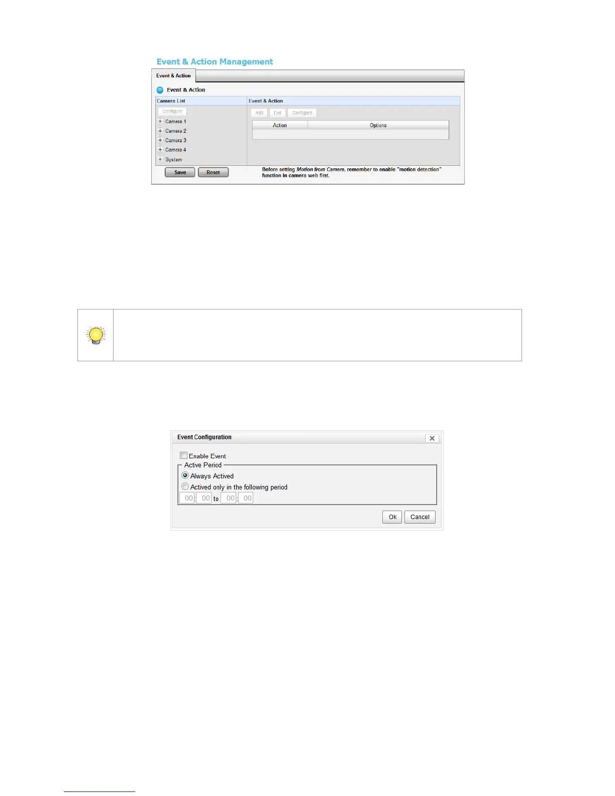 When setting the event Motion from Camera, make sure to set up the camera’s