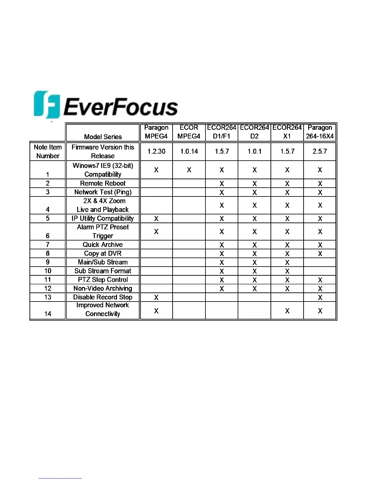 The following chart shows the firmware release versions and the related features for each model