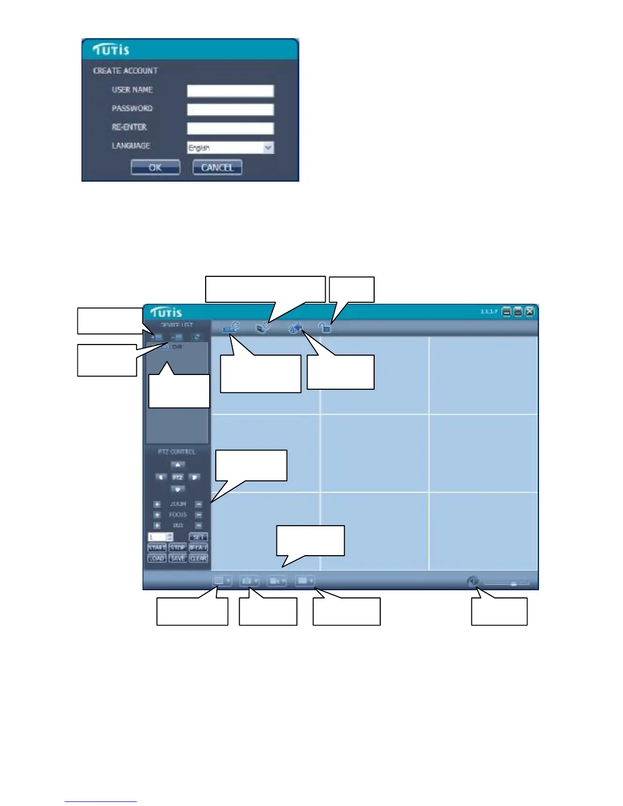 n the TUTIS CMS, there are adding device, live preview, video playback, system setup,