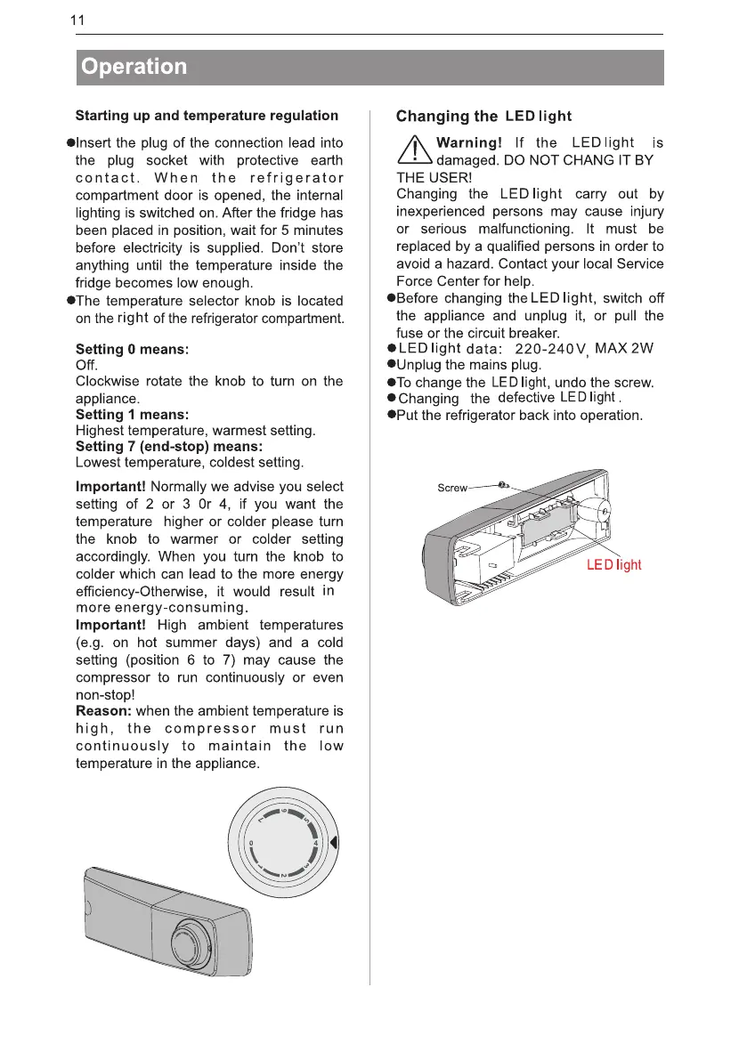 Everglades EVOD211 - Operation; Starting up and Temperature Regulation; Changing the LED Light