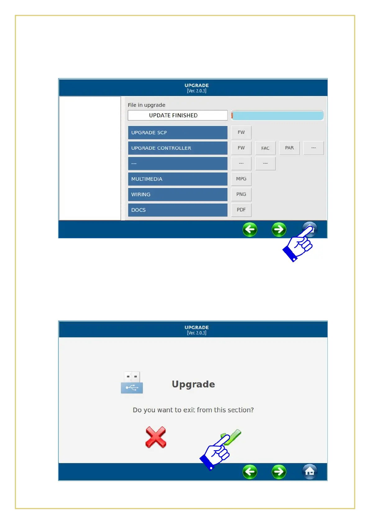 Checkmark icon to exit from the update procedure. The control will then reboot and