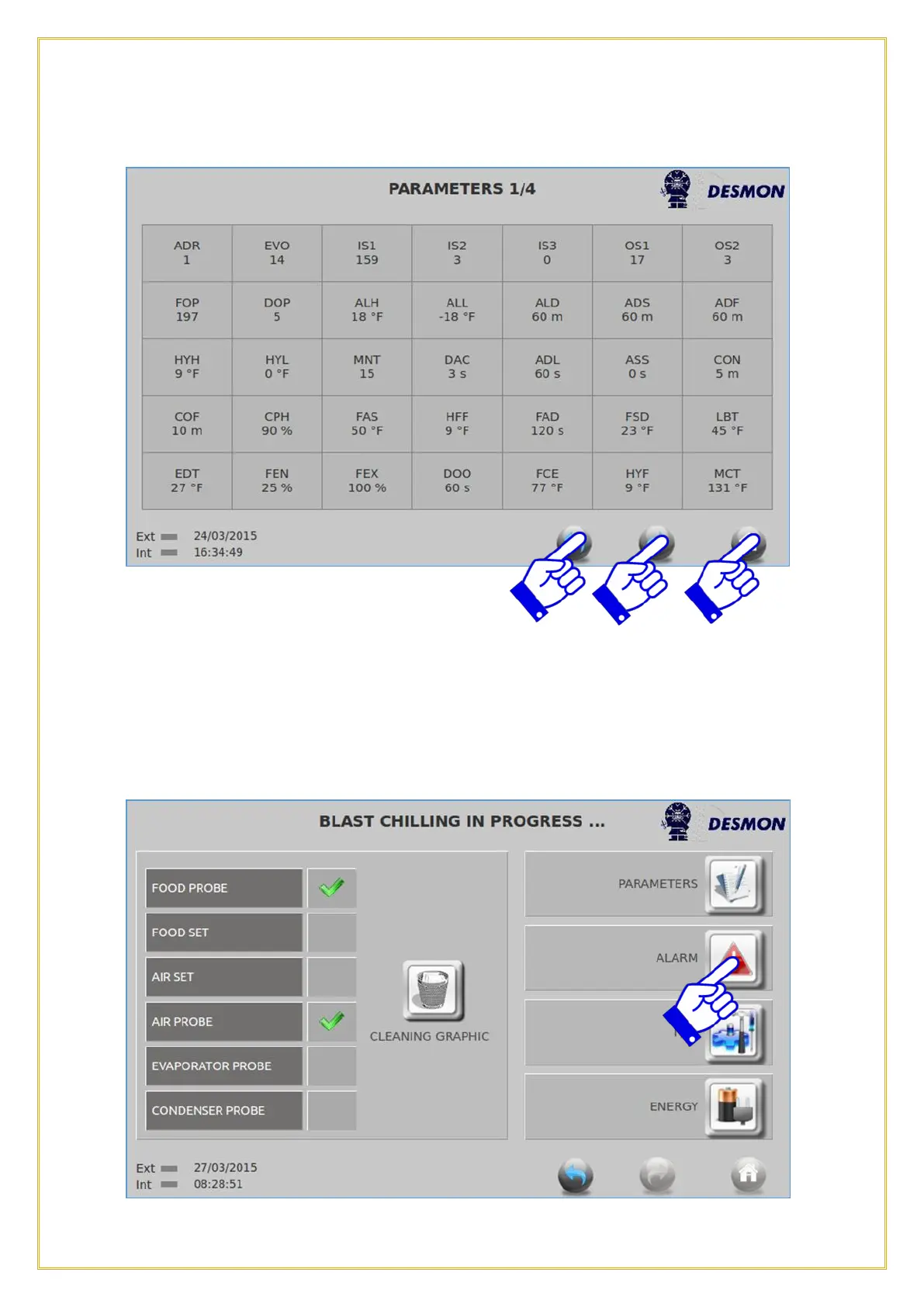 The user or service technician can page through the 4 pages of parameters, by using the