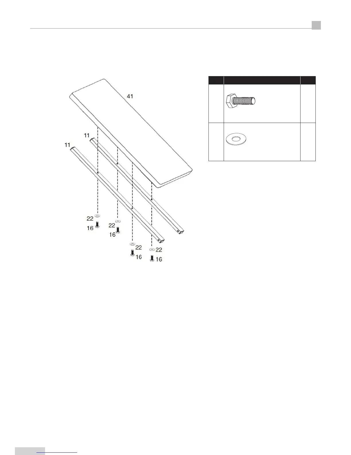 Fit the Backrest Supports (11) to the Backrest (41) using four M6 x 40mm Bolts (16) and four