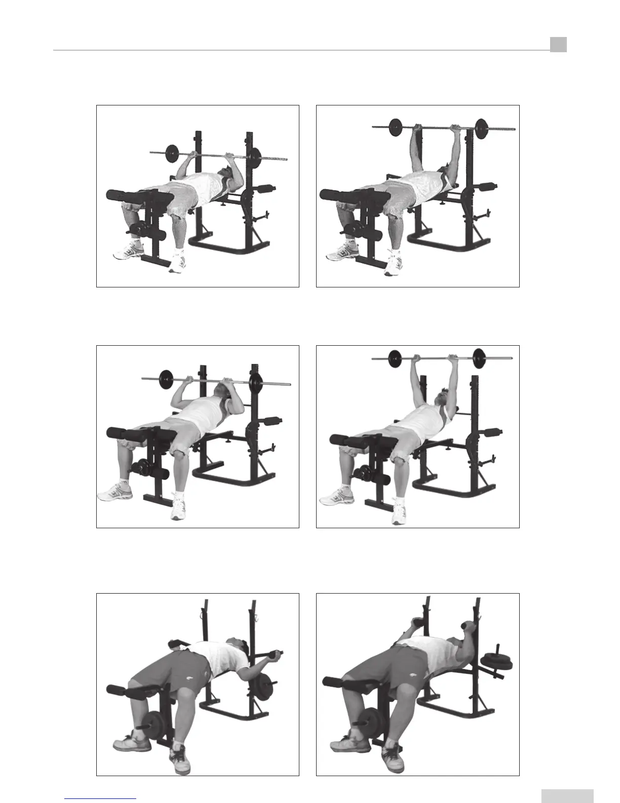 Adjust bench to a flat position. Lift bar off the rest. Bring bar down until it touches your chest.