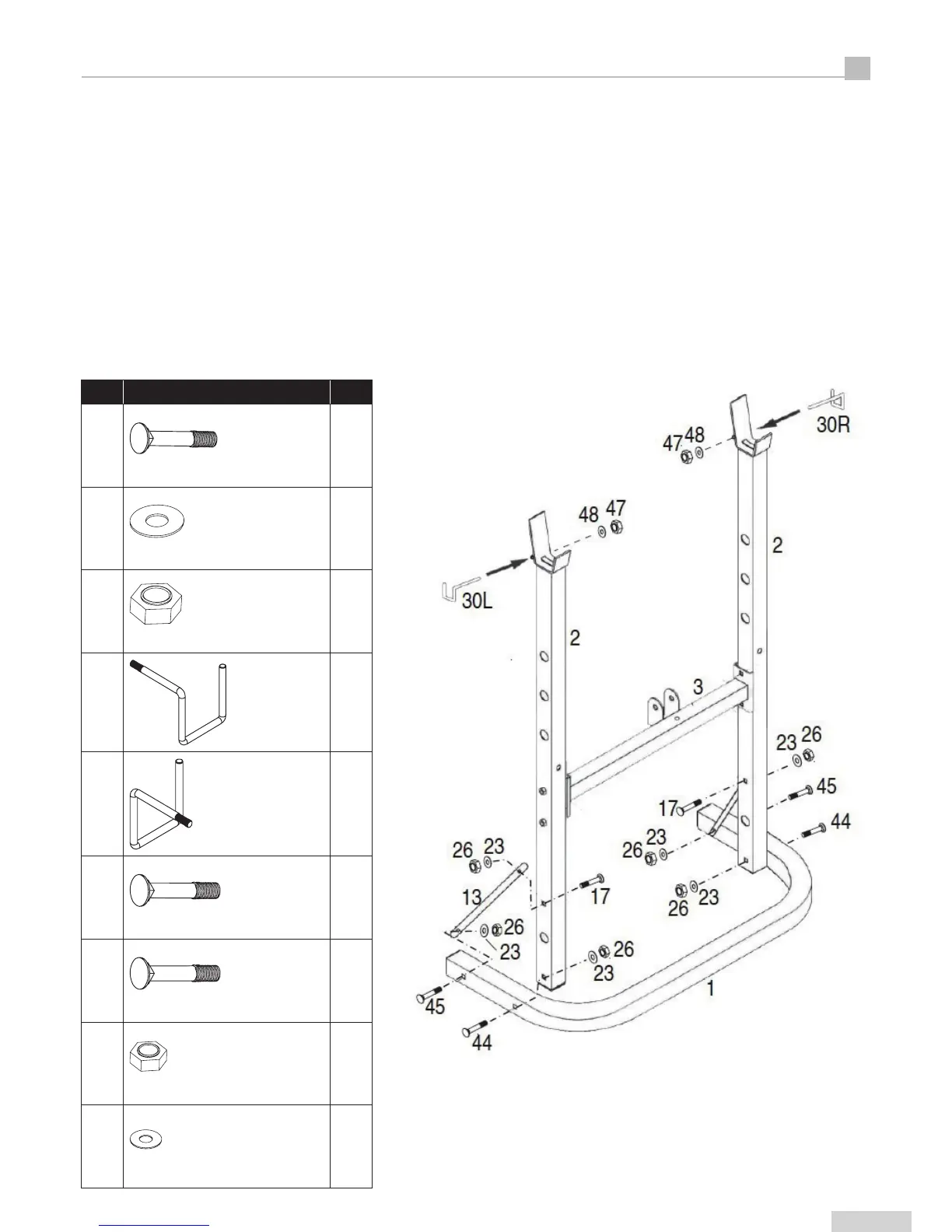 • Attach the Safety Hook (30L & 30R) to the both Uprights (2). Using two Washers (48) and two