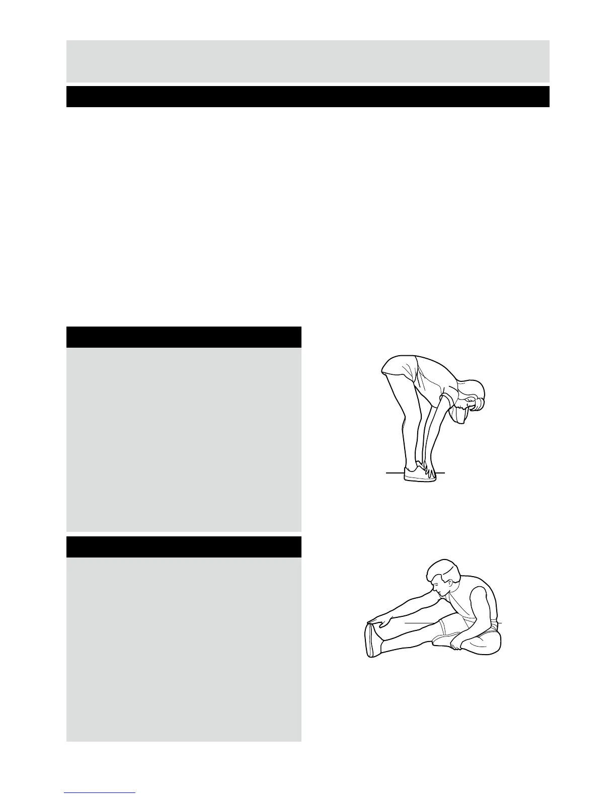 For a correct warm up, see the following basic stretching exercises. Move slowly as you stretch, never bounce.