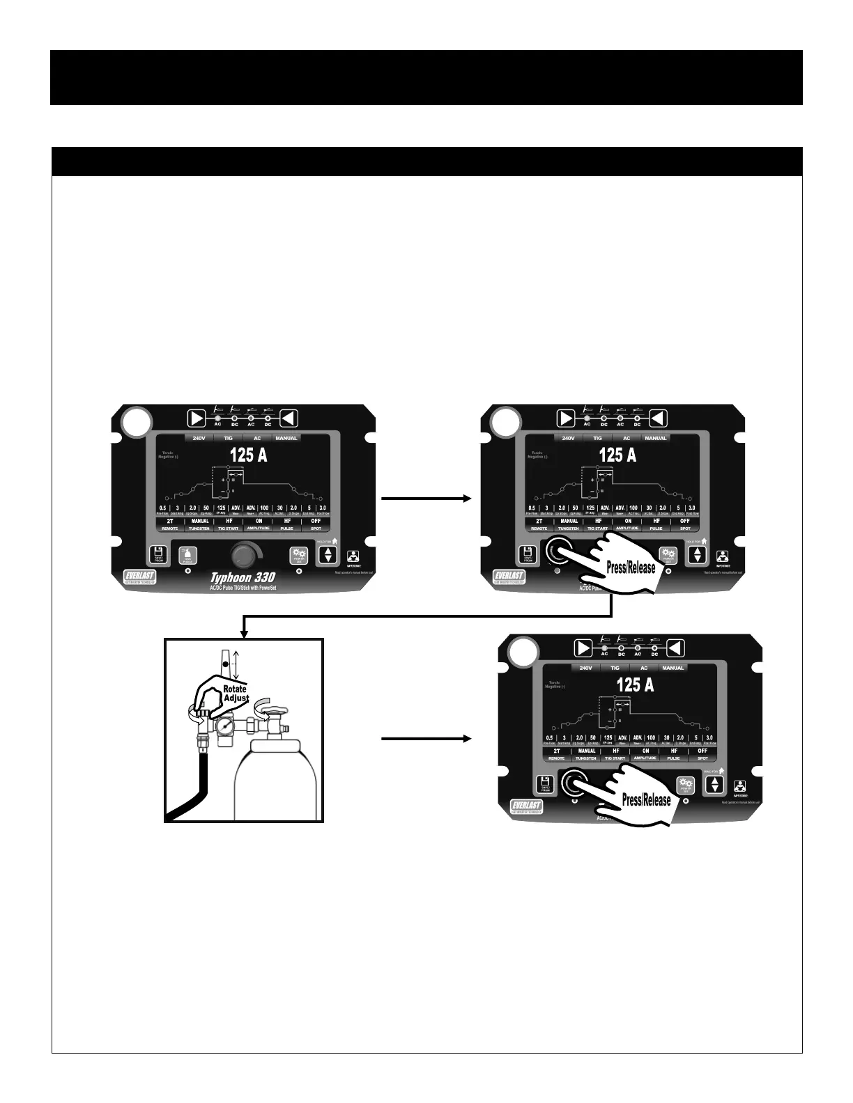 3. Open the cylinder valve fully and adjust the regulator to the gas flow rate suggested in this manual for the size cup you are using. See page 20.