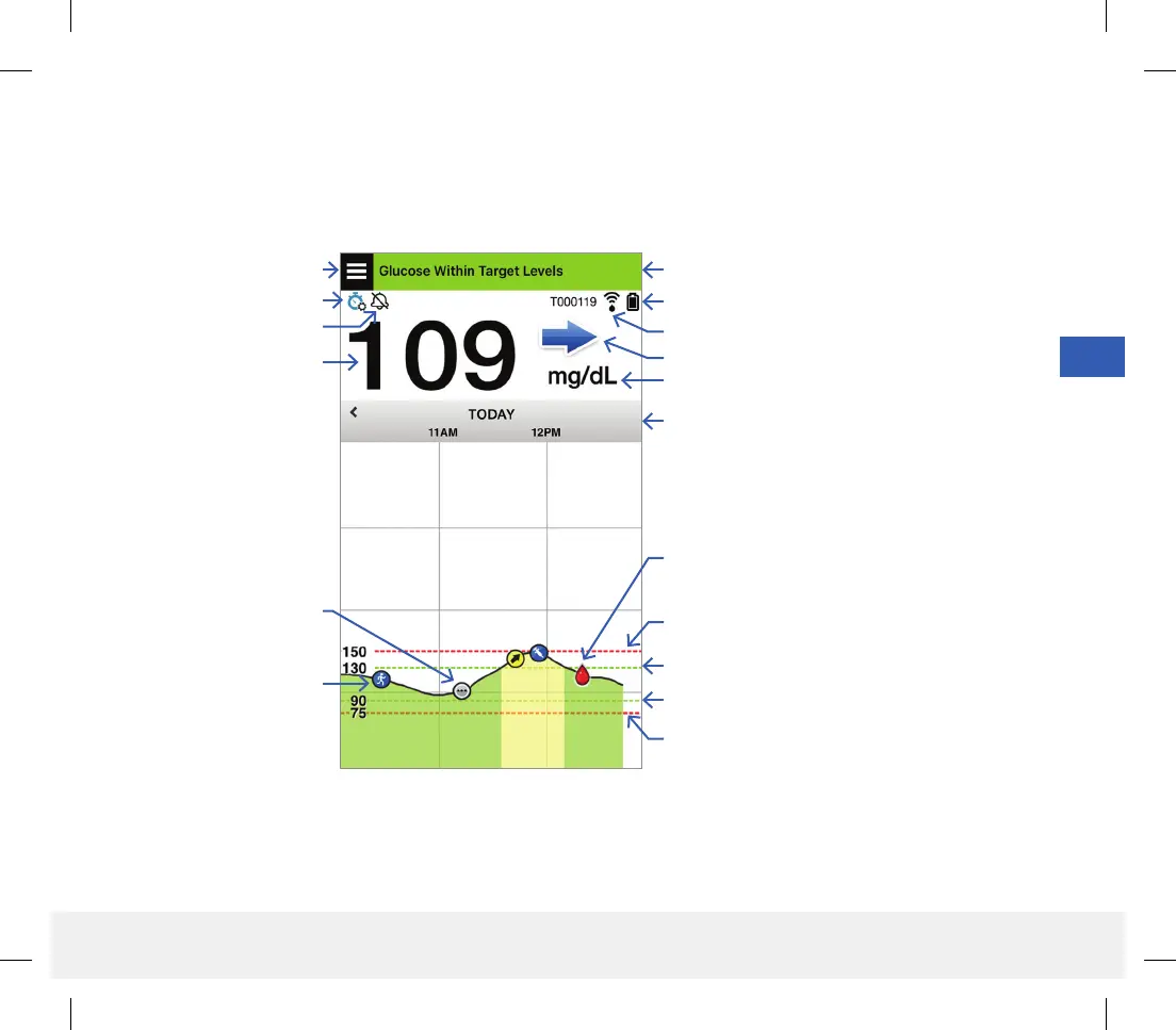 glucose readings, direction and rate of change arrow, trend graph, events, calibrations, alerts and notifications.