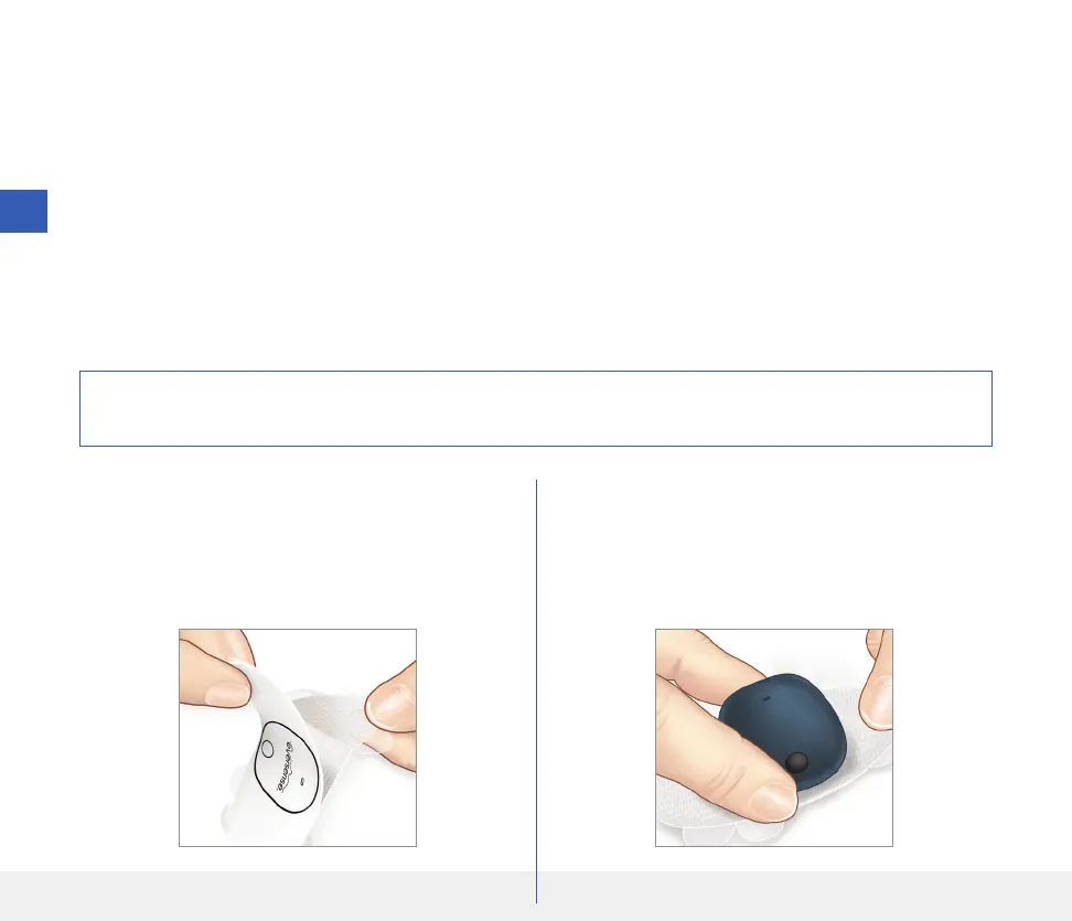 The smart transmitter must be secured on the skin directly over the sensor with the disposable adhesive patch. Each