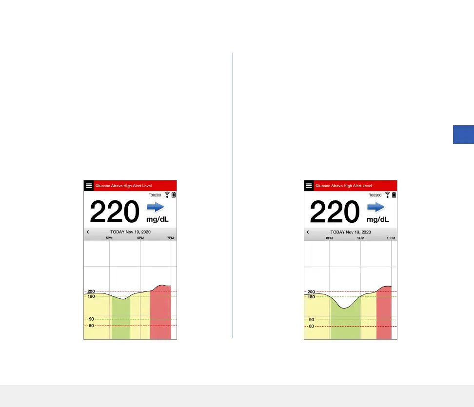 Glucose above high alert level at 220, and changing gradually. Your glucose could drop to 190 or rise to 250