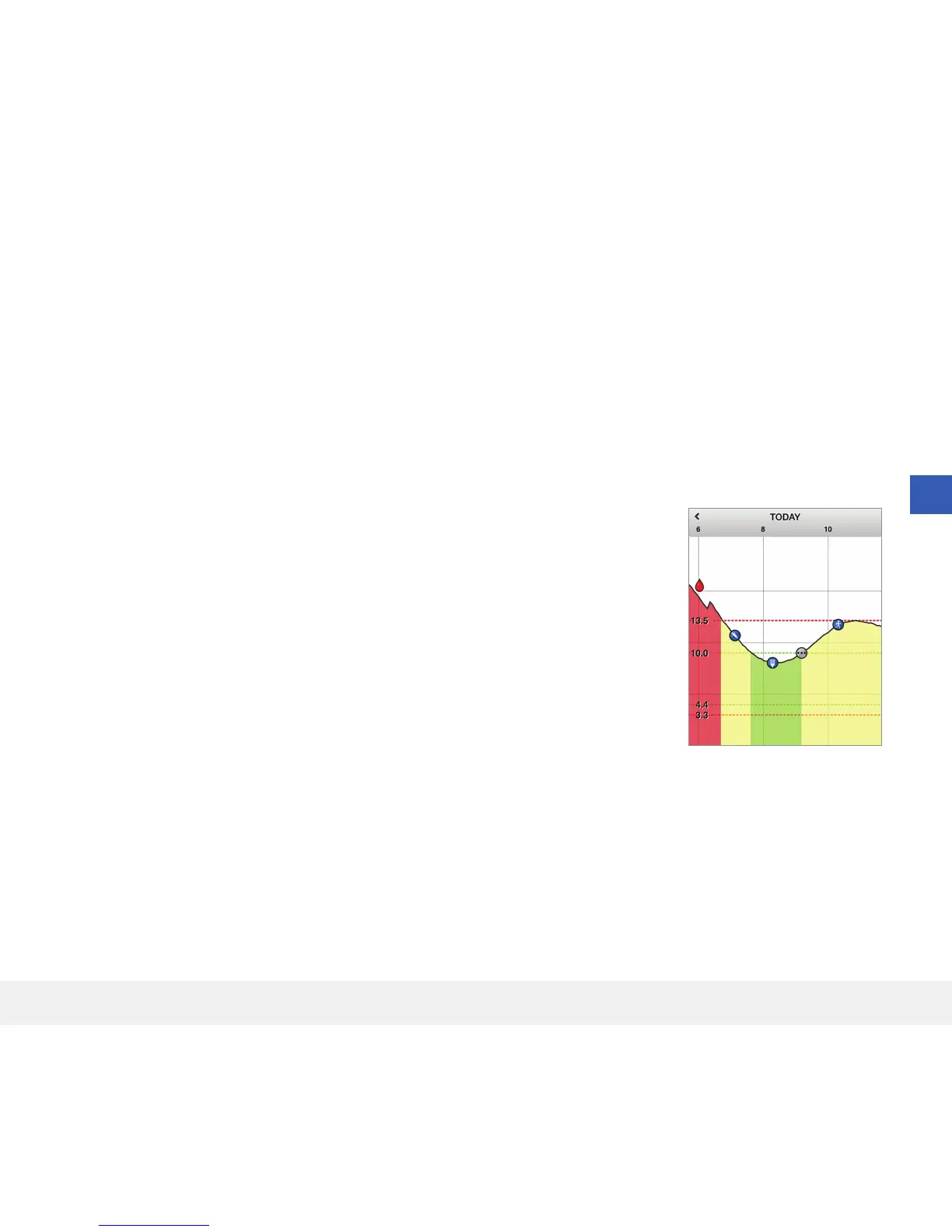 • Shaded areas of the graph are color coded as follows depending on the glucose settings you enter: