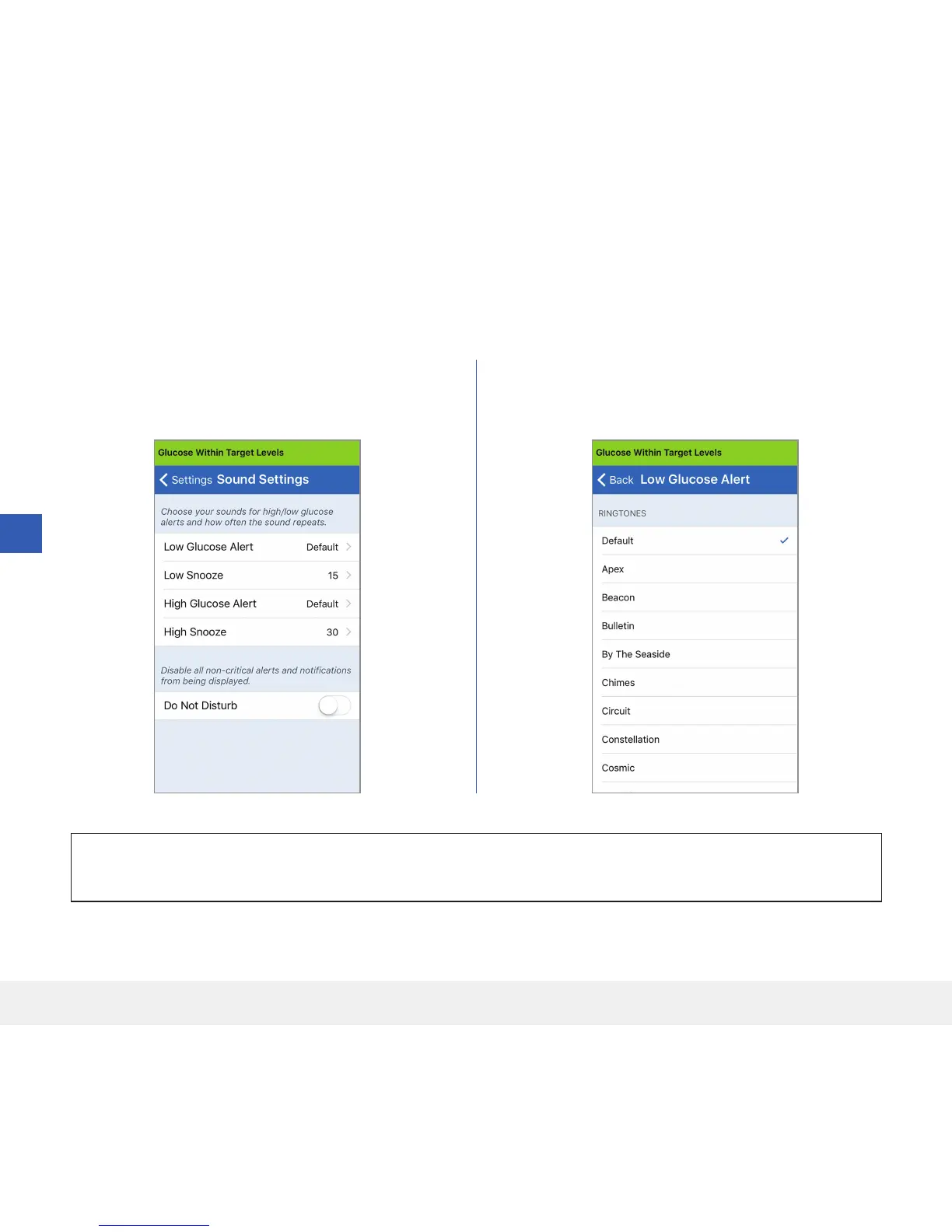 The SOUND SETTINGS screen displays the alert sound settings for Low Glucose and High Glucose. This screen