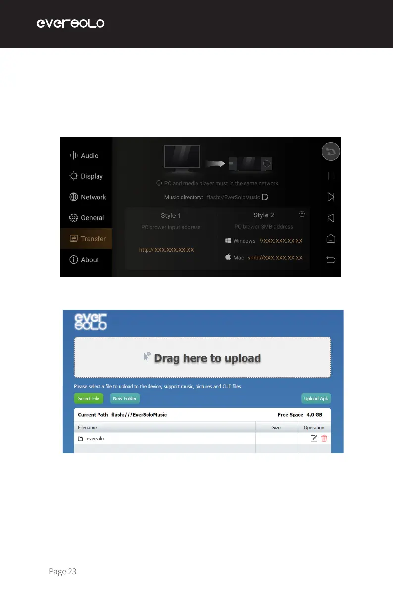 Access“Settings > Transfer” to transfer songs from computer to this device according to the