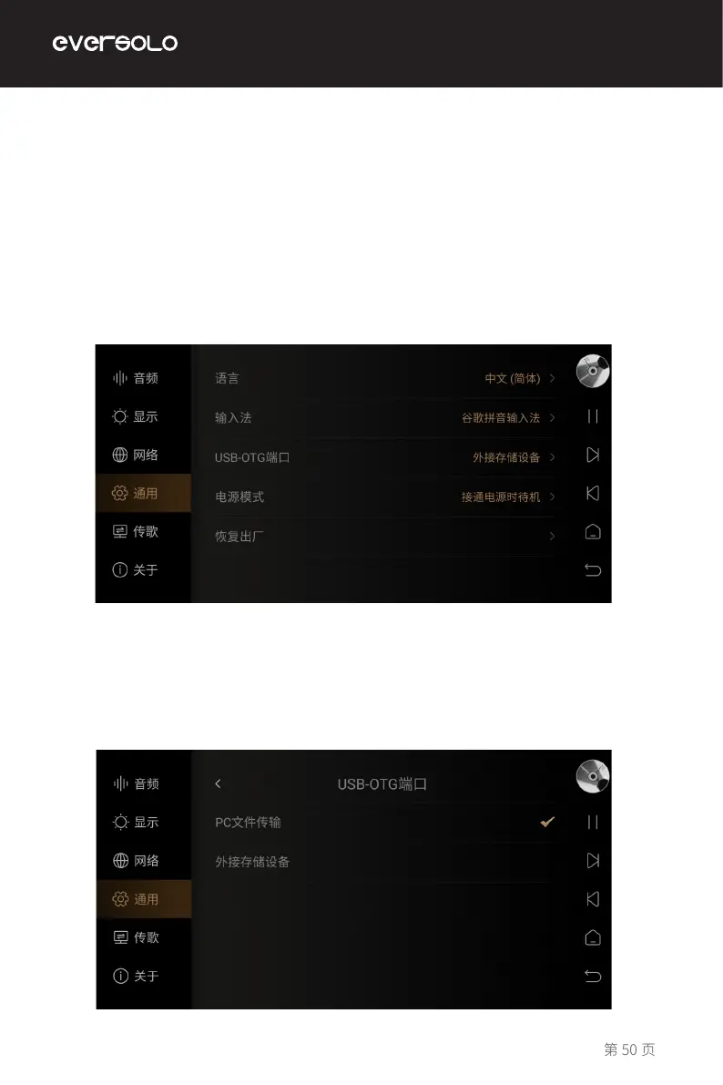 件的拷贝和管理。进入设置菜单 >“通用” >“USB OTG端口” >“PC文件传输”。