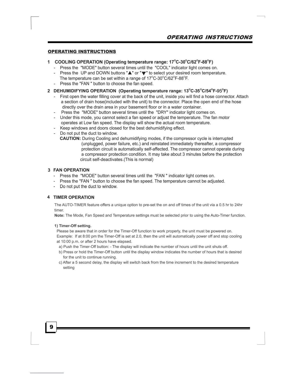 Everstar MPM2-12CE-BB4 - Operating Instructions; Cooling Operation; Dehumidifying Operation; Fan Operation