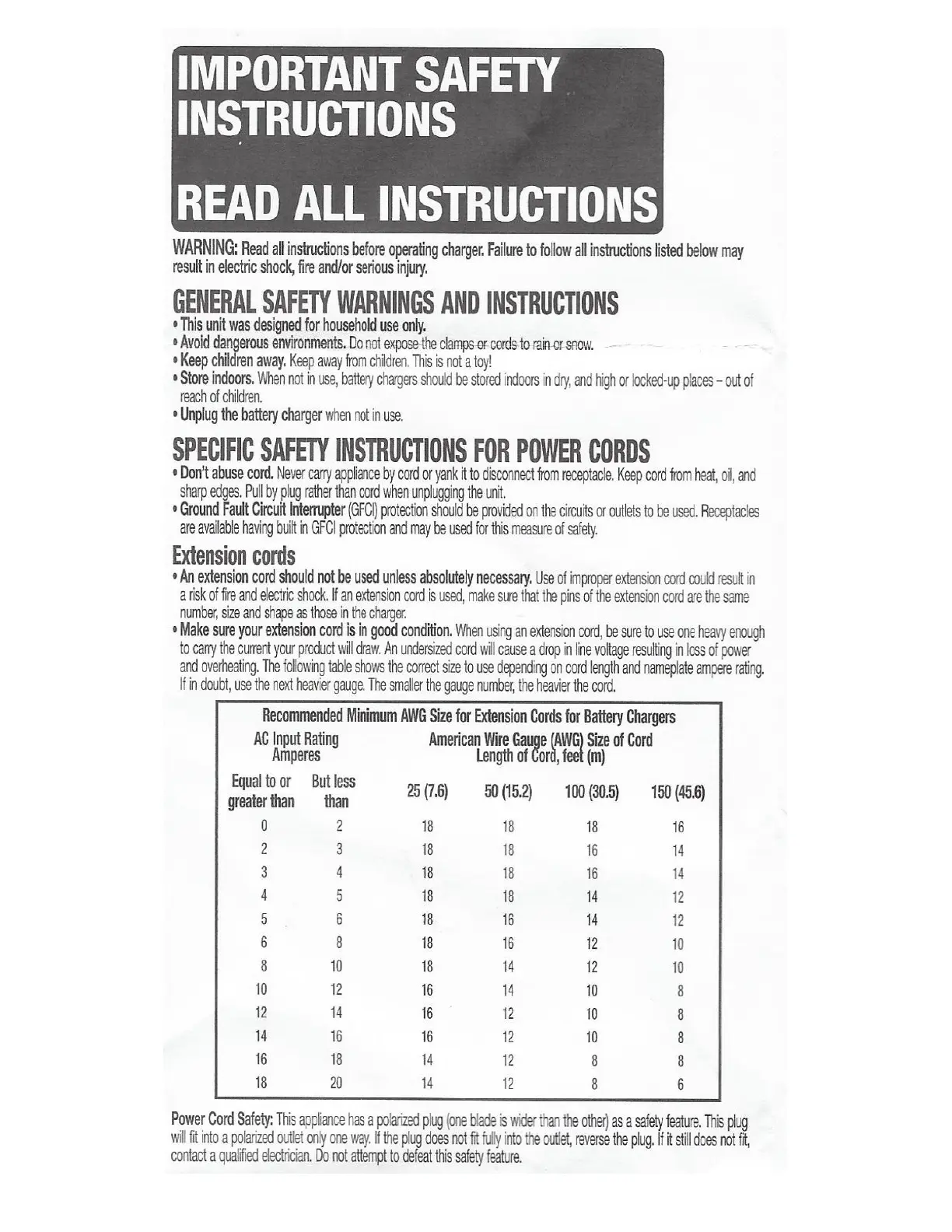EverStart BM1E - Important Safety Instructions; General Safety Warnings and Instructions; Specific Safety Instructions for Power Cords