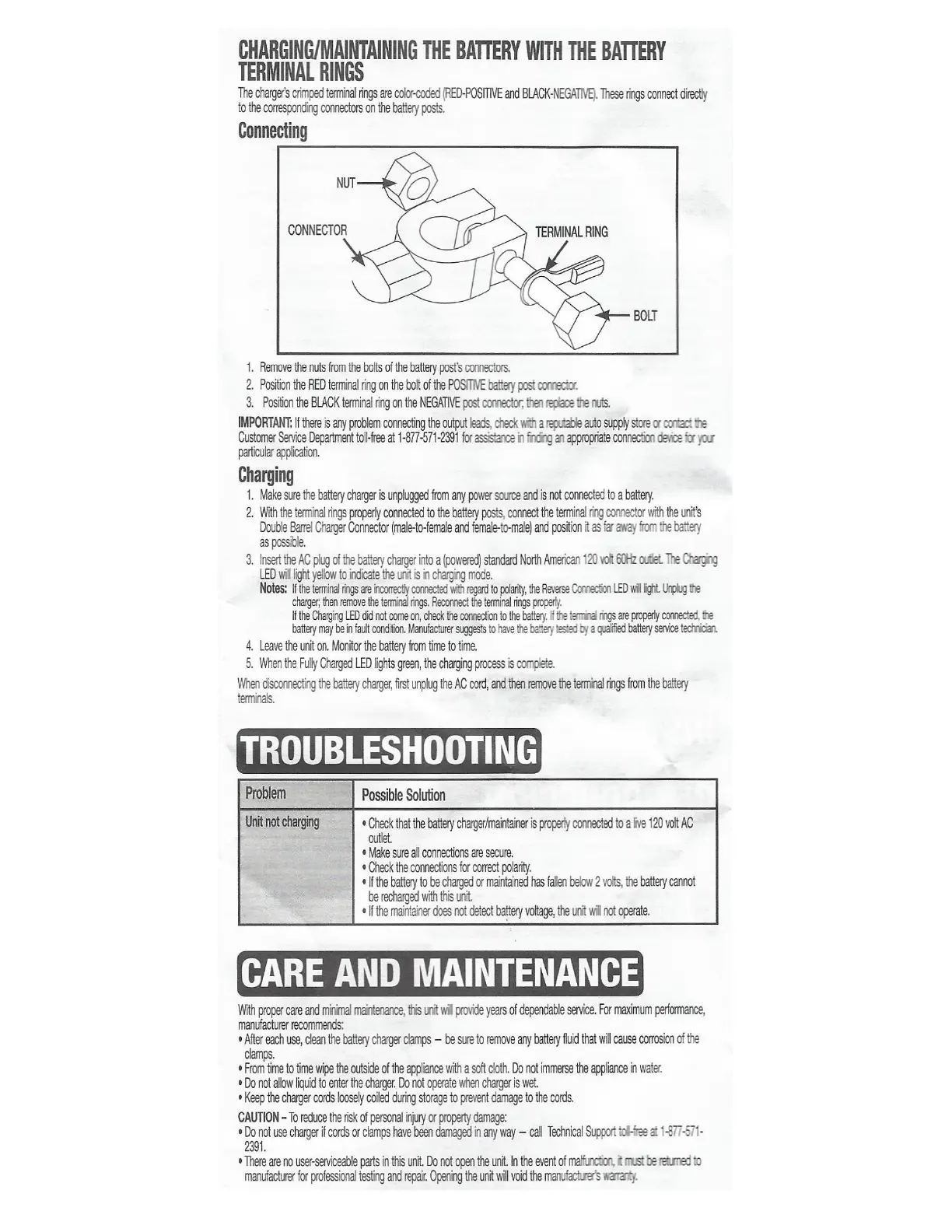 EverStart BM1E - Charging;Maintaining the Battery with the Battery Terminal Rings; Troubleshooting; Care and Maintenance