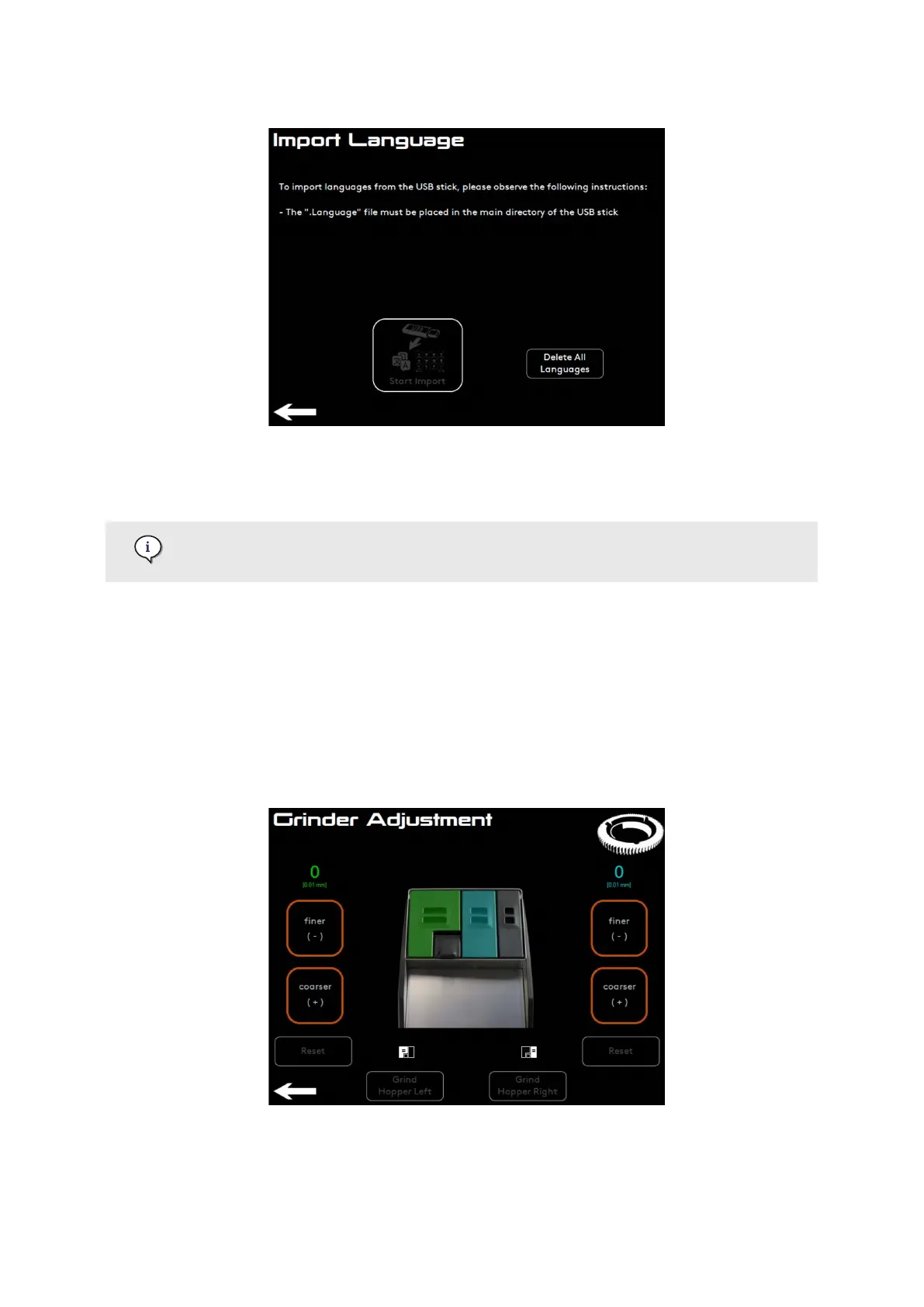 From the Grinder Adjustment menu it is possible to manually adjust the grind size of the coee