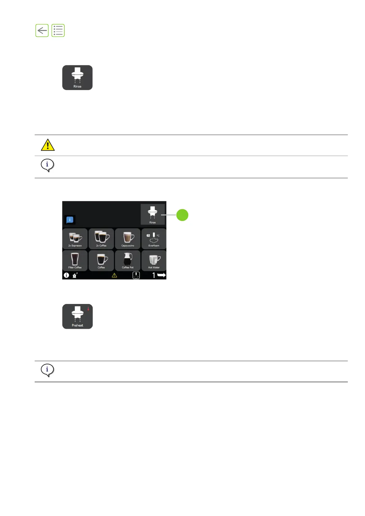 To initialize the machine, it is necessary to rinse after each startup. Each time a rinse is necessary this