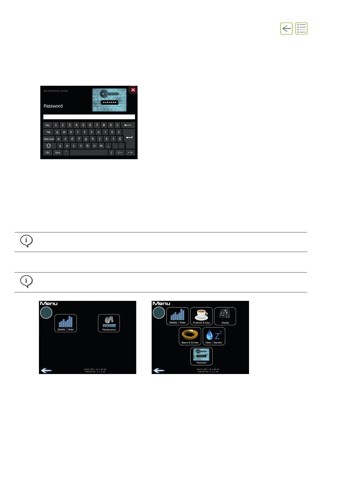 Operator access lets you view statistics (product counter) and cleaning history.