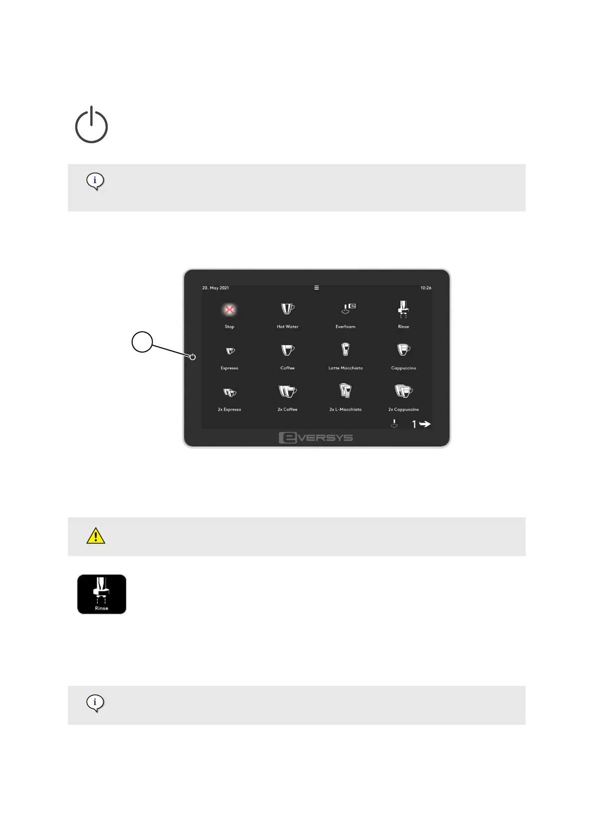 To Initialise the coee machine, it is necessary to rinse after each startup. Each time a rinse is